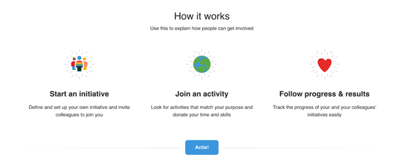 With the activities block, you can directly show activities that people can participate in on your homepage. This is the perfect way to get your visitors active. We offer different settings to display activities. Make sure to add a title and subtitle to this block, in order to set the right expectation for the activities that will be displayed.