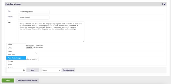 To include this block scroll down to the dropdown menu and select Plain Text + Image.
