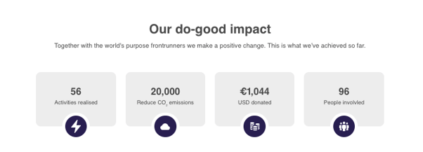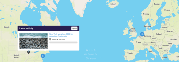 The map gives your users an overview of all your activities around the world. This feature is very useful to grasp in a glance where you are spreading your positive impact. Keep in mind that the latest activity created is always first openly displayed.