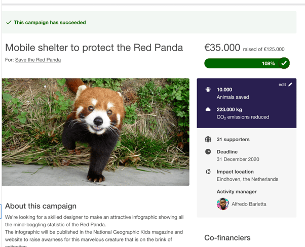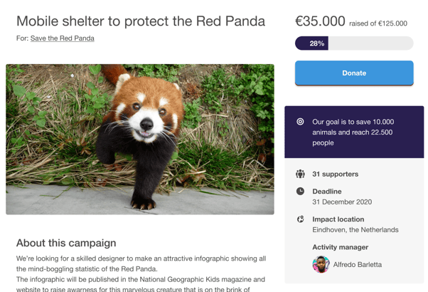 In the back office, we already show the engagement results of your platform in the standard reporting dashboards. The platform engagement is measured through the use of the platform, like the number of activities, donations, and people involved. This is the input, whereas impact statistics show the tangible output made with activities, connecting a bigger purpose to the personal purpose of the platform users.